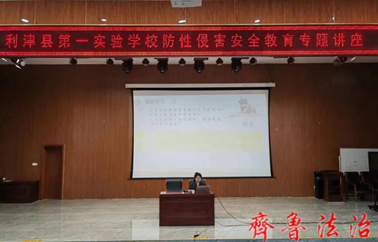 5月12日,东营利津法院少年法庭干警到县第一实验学校为五年级全体学生开展防性侵安全教育专题讲座。
