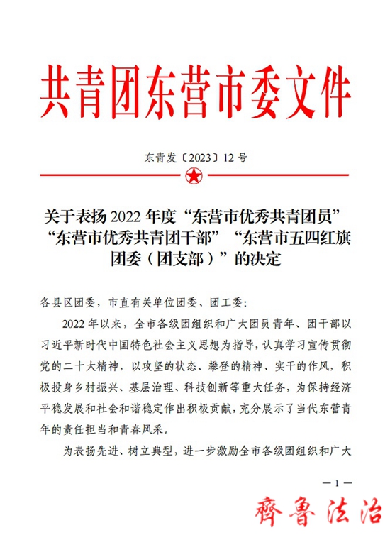 齐鲁法治(东营讯)李春军 在五四青年节来临之际,共青团东营市委对全市2022年度“东营市优秀共青团员”“东营市五四红旗团委”等进行了通报表扬,东营中院多个集体和个人获荣誉称号。