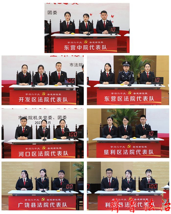 中院在家院领导,市委市直机关工委副书记韩兵、共青团东营市委副书记隋海建、市直机关党建工作第一联系片区成员单位党务干部、中院全体干警在主会场参加活动,各县区法院院领导和干警在分会场通过视频观看比赛。