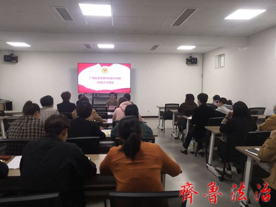 东营广饶法院员额法官、广饶街道法官工作站站长李美芹到广饶街道矛调中心作了题为“发挥人民调解职能 有效化解矛盾纠纷”的专题讲座,对街道40余名人民调解员进行业务培训指导