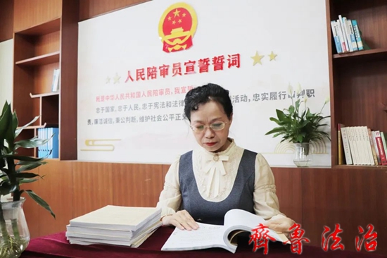 齐鲁法治(东营讯)李春军 阅读《人民法院报》《山东法制报》是端青的日常功课,书架上密密麻麻摆放的法律书籍和报刊很难让人联想到这名人民陪审员四年前是个“门外汉”,晦涩的法律术语更是需要她花费大量的时间去研读,隔行如隔山,对端青而言,作为一名法律外行人担任人民陪审员是挑战和光荣,更是责任,而端青也在履职过程中,锐意进取,积极作为,诠释了一名人民陪审员的担当和奉献。
