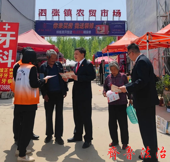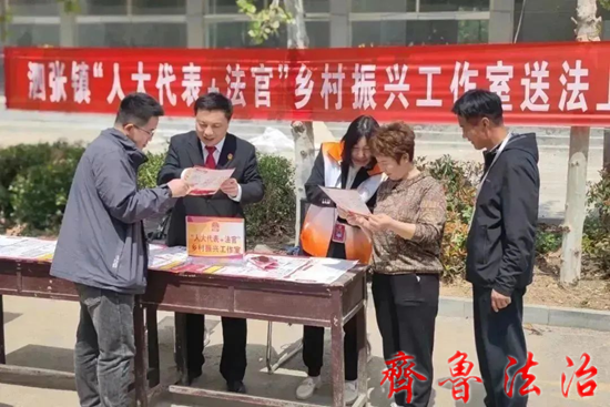 齐鲁法治(济宁讯)于清林 为深入学习贯彻党的二十大精神,进一步提升司法为民服务水平,4月17日,济宁泗水法院依托“人大代表+法官”乡村振兴工作室,联合派驻工作室人大代表在泗张镇开展了送法上集市普法宣传活动。