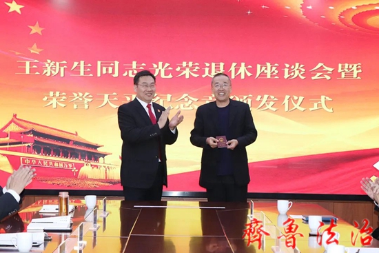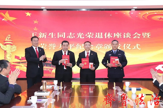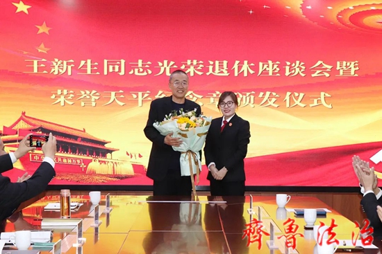 齐鲁法治(东营讯)李春军 4月14日下午,东营利津法院召开王新生同志光荣退休座谈会暨荣誉天平纪念章颁发仪式,欢送王新生同志光荣退休,并向在法院工作满30年的3名干警颁发荣誉天平纪念章及证书。党组书记、院长孙学军出席仪式并讲话,党组成员、副院长王学臣主持仪式,在家院领导、部分庭室负责人及青年干警代表参加仪式。
