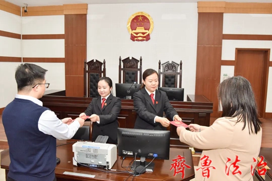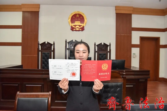东营市东营区法院家事审判团队为一起调解离婚案件的当事人发出统一制式《离婚证明书》,这是东营区法院发出的首份《离婚证明书》。