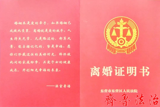 东营区法院出具的《离婚证明书》仅载明双方当事人的姓名、性别、身份证号码、判决(调解)离婚法律文书的案号、生效日期,同时加盖东营区法院院印,不涉及当事人的个人隐私问题,不仅避免了因隐私泄露而造成的尴尬,同时也解决了离婚法律文书不易保管携带的问题。“婚姻本是爱的牵手,如果婚姻已成彼此负累,离婚就是爱的放手……”在《离婚证明书》的背后,附有充满人文关怀的法官寄语,以温馨的话语引导当事人放下过去,从容开启新的生活。