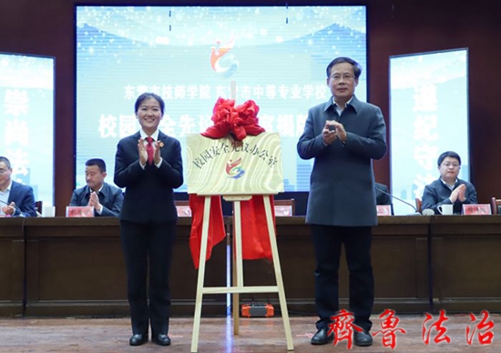 3月27日,在第28个全国中小学生安全教育日,东营中院联合市关工委、团市委、市教育局、开发区公安分局,在东营市技师学院举行校园安全先议办公室揭牌仪式。