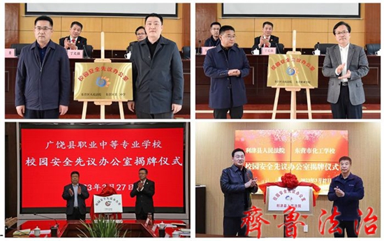 同日,东营区法院、利津县法院、广饶县法院分别在4所学校挂牌成立了校园安全先议办公室。截止目前,全市法院已在6所学校成立校园安全先议办公室。