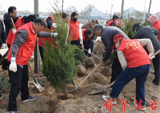 初春时节,东营中院驻村组积极组织园林绿化队伍,对大杜村法治文化公园内部及周边区域进行绿化美化,并积极浇灌黄河水确保成活率。
