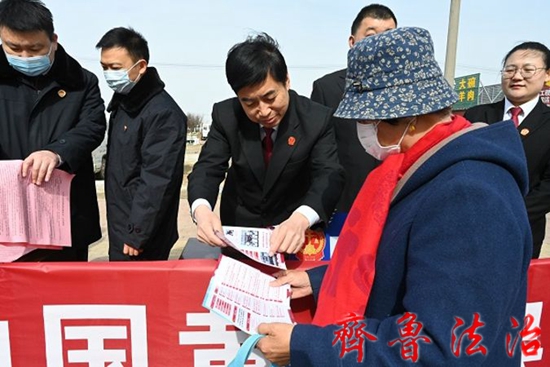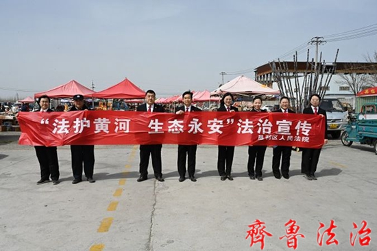 齐鲁法治(东营讯)李春军 为进一步提高《中华人民共和国黄河保护法》的社会知晓度和影响力,提升群众爱河护河意识,3月24日上午,东营垦利区法院党组成员、审判委员会专职委员周卫亭带领环境资源审判团队到双河大集开展“法护黄河 生态永安”集中宣传活动。