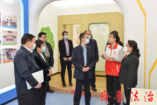解西义一行参观了东营区法院法治教育基地、家庭教育指导一体化工作站、未成年人审判社会工作站,详细了解了东营区法院“朝阳花开”未成年人审判工作品牌创建的目的、内容和举措,观看了专题片《守护一抹暖阳 静待朝阳花开》。