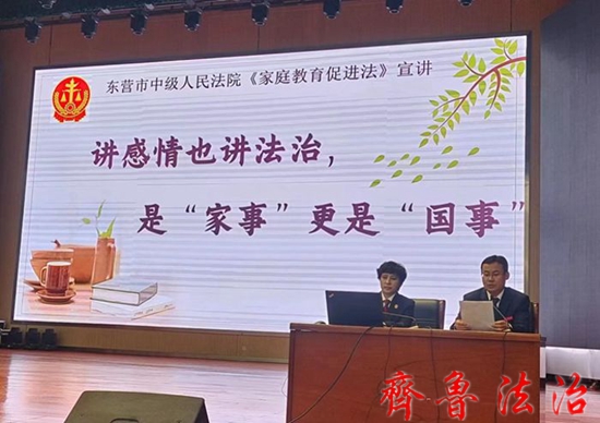 齐鲁法治(东营讯)李春军 阳春三月,玉兰绽放。3月17日下午,东营中院将家长课堂搬到了校园,少年法庭法官桑爱红以《讲感情也讲法治,是家事更是国事》为题为东营市一中19个班级的1000余名家长开展了家庭教育指导。