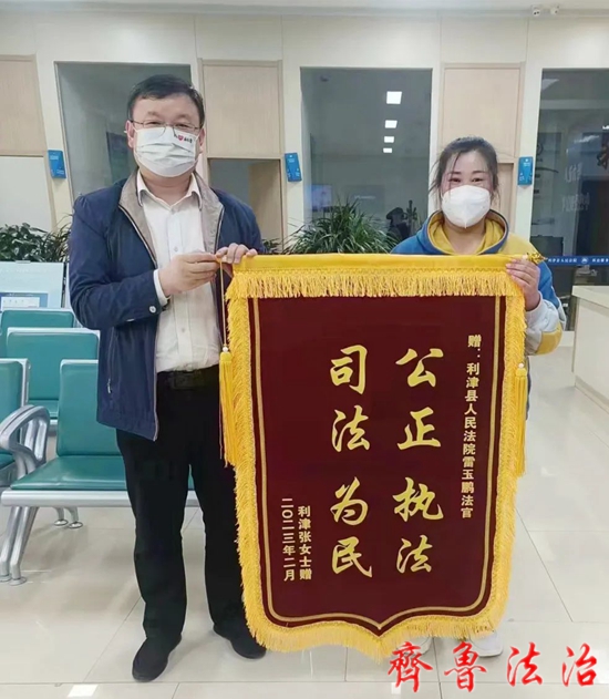 齐鲁法治(东营讯)李春军 “感谢雷法官,被告已经偿还了欠款,多亏雷法官的努力调解!”原告张某某激动地对案件承办人东营利津法院雷玉鹏法官连连表示感谢,并亲手送上一面书有“公正执法 司法为民”八个大字的锦旗。