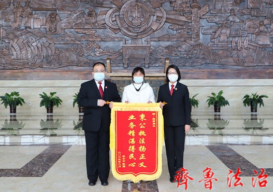 齐鲁法治(东营讯)李春军 近日,一起劳动争议案件的当事人李某为东营中院民一庭送来一面“秉公执法扬正义,业务精湛得民心”的锦旗,对法院工作表示感谢,对法官一心为民、高效办案工作作风给予了充分肯定和认可。