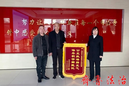 2月23日上午,林某、吕某两名当事人将一面书有“公正执法扬正气 恪尽职守解民忧”的锦旗送到东营利津法院陈庄法庭于洪伟法官手中,感谢法官高效公正办案,及时维护其合法权益