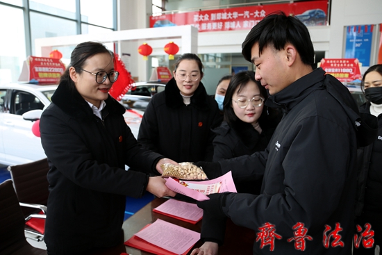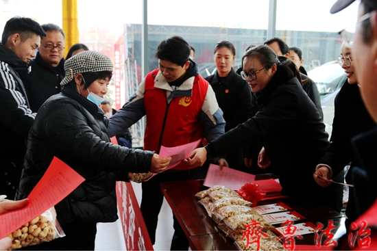 山东省郯城县人民法院抓住有利时机,组织干警联合郯城街道龙江社区走上街头、深入社区、走进企业开展“送豆子、送法律、送祝福”活动