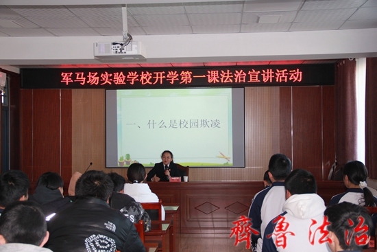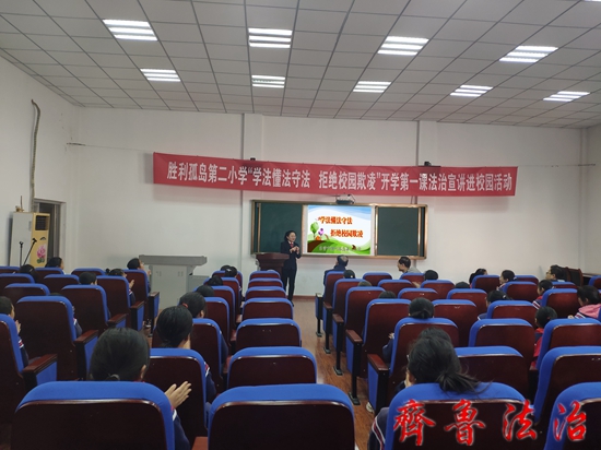 齐鲁法治(东营讯)许新华 为进一步推进平安校园建设,提升中小学生的法治意识和自我保护意识,2月15日,东营河口法院少审团队干警先后到孤岛二小、军马场实验学校,为一百余名师生开展“校园欺凌”主题法治宣讲。