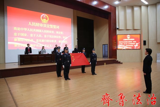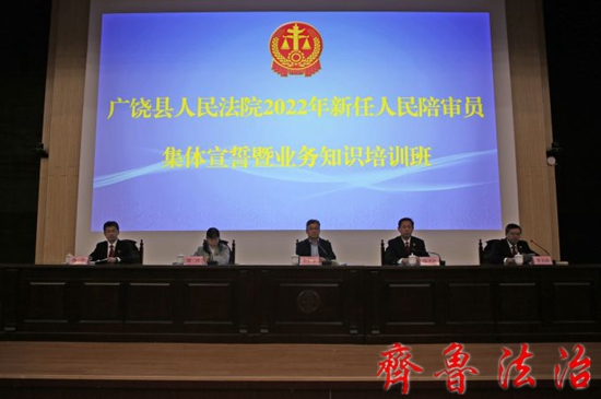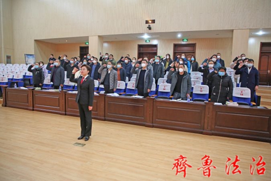 齐鲁法治(东营讯)李春军 为进一步提高人民陪审员法律素养和履职能力,2月9日上午,东营广饶法院组织举行2022年新任人民陪审员集体宣誓及业务知识培训班开班仪式。县人大常委会副主任李军章,县法院党组书记、院长陈立田出席会议并讲话。新任45名人民陪审员参加会议,县法院党组副书记、副院长李玉山主持会议。