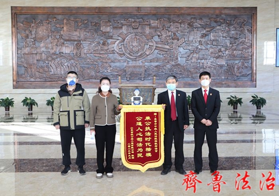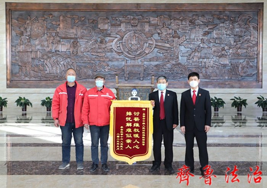 2月1日,两位申请执行人和农民工代表给东营中院送来锦旗,感谢执行工作人员在春节前迅速执行,让农民工过了一个暖心、踏实的春节。