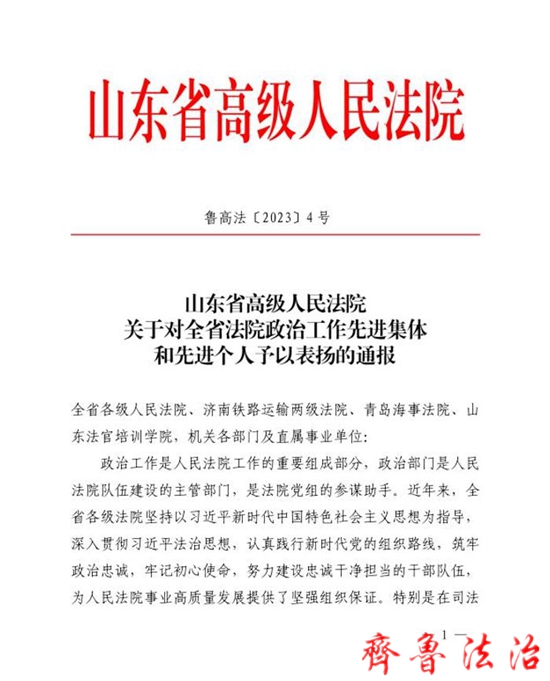 齐鲁法治(东营讯)李春军 近日,东营法院4个集体,7名个人受省法院通报表扬。为表彰先进、激励队伍,进一步激发全省法院干警干事创业、争先创优的精气神,展现新时代山东法院的良好风貌,省法院对“两个确立”主题教育、“为群众办实事示范法院”创建活动组织奖和先进个人予以通报表扬。东营法院2个集体、2名个人受到表扬。其中,东营区法院获得“两个确立”主题教育组织奖,东营中院邢敏获得“两个确立”主题教育先进个人,利津县法院获得“为群众办实事示范法院”创建活动组织奖,开发区法院孙东平获得“为群众办实事示范法院”创建活动先进个人。