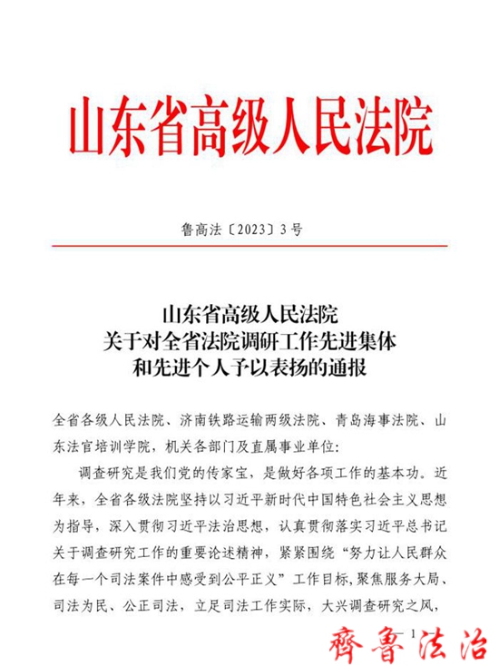 为表彰先进、激励队伍,奋力开创调研工作新局面,近日,山东省高级人民法院对全省法院50个集体和100名个人予以通报表扬。东营法院2个集体、4名个人受到表扬。
