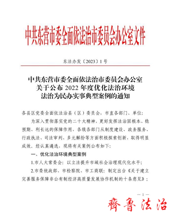 齐鲁法治(东营讯)李春军 近日,中共东营市委全面以法治市委员办公室对2022年度优化法治环境法治为民办实事典型案例进行评选,东营中院“完善机制大力加强生态保护”案例入选。