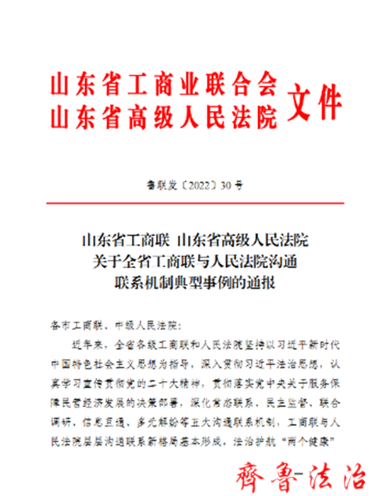 齐鲁法治(东营讯)李春军 近日,山东省工商业联合会、山东省高级人民法院发布《关于全省工商联与人民法院沟通联系机制典型事例的通报》,东营垦利区工商联、垦利区法院共建沟通联系机制做法入选全省18个典型事例。