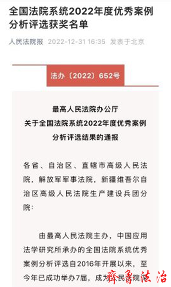 近日,最高人民法院公布了全国法院系统2022年度优秀案例分析评选获奖名单,东营垦利区法院法官助理门彩凤编写的案例荣获民事案例优秀奖,这也是该项活动中全市法院系统唯一获奖的案例