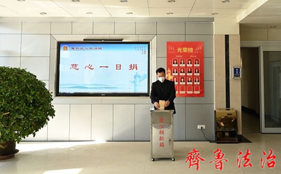 齐鲁法治(东营讯)李春军 为弘扬中华民族崇德向善、乐善好施的传统美德,12月19日上午,东营垦利区法院举行“慈心一日捐”善款捐赠活动。活动中,院领导率先垂范,党员干部充分发挥模范带头作用,全体干警踊跃参加,以实际行动支持慈善事业。