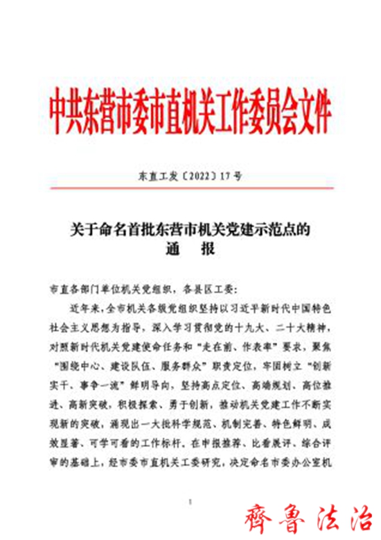 齐鲁法治(东营讯)李春军 近日,东营市委市直机关工委发文,通报一批科学规范、机制完善、特色鲜明、成效显著、可学可看的工作标杆,并正式命名市委办公室机关党委等29个市直机关基层党组织和东营区法院机关党委等17个县区机关基层党组织为首批“东营市机关党建示范点”。