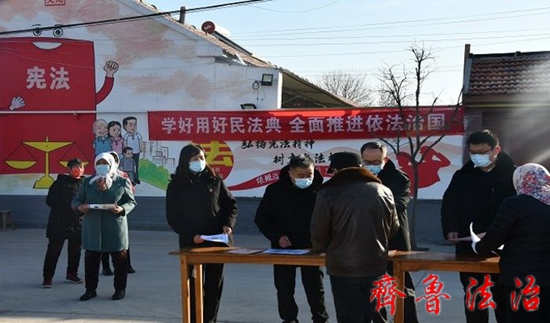 12月2日,东营市法院驻村组组织东营区人民法院辛店法庭法官到牛庄镇大杜村开展“学好用好民法典,全面推进依法治国”国家宪法日主题宣传活动。