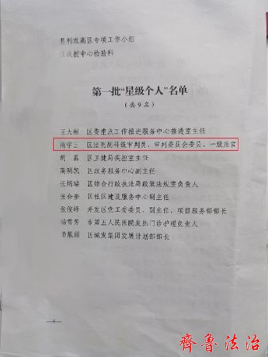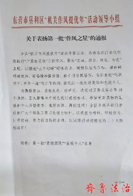 齐鲁法治(东营讯)李春军 9月29日上午,东营垦利区“机关作风提优年”活动推进会议召开,会上通报表扬了第一批“作风之星”,东营垦利法院尚学三同志荣获全区第一批星级个人荣誉称号。