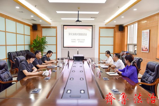 9月15日上午,东营市东营区法院召开深化油地对接工作座谈会,东营区法院审判委员会专职委员李兰海、民一庭第二团队负责人程全刚,油气集输总厂副厂长邢量、企管法规部负责人王清等人员