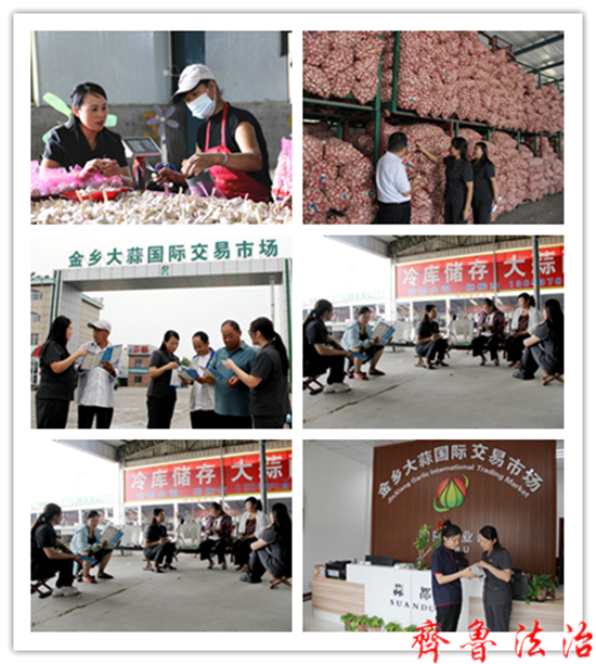 在金乡大蒜国际交易市场,农产品交易纠纷审判法庭法官靳慧云针对金乡大蒜交易市场矛盾较为突出的民间借贷、买卖合同、农产品加工、仓储合同等案件,向群众讲解案件中利息、担保、诉讼时效等法律规定。同时,结合有典型意义的案件开展以案释法,以“个性”案件中的“共性”法律问题,向周围群众普及如何预防民间借贷、买卖合同、仓储合同等案件中的陷阱以及如何有效保存和收集证据等相关法律常识。