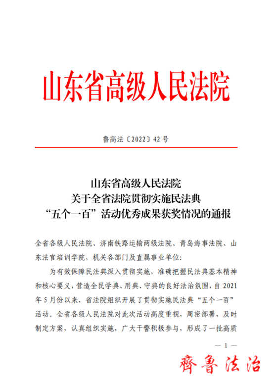 8月11日上午,山东法院举办全省法院贯彻实施民法典“五个一百”活动座谈交流会,通报“五个一百”活动优秀成果获奖情况,交流经验做法,共评选出优秀文书、典型案例各 35 篇,优秀庭审