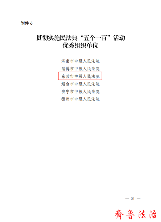 东营中院荣获贯彻实施民法典“五个一百”活动优秀组织单位, 3名干警入选贯彻实施民法典“五个一百”活动先进法官及法官助理,2个短视频入选贯彻实施民法典“五个一百”活动优秀“法官说典”短视频,1篇文书入选贯彻实施民法典“五个一百”活动优秀裁判文书,1篇案例入选贯彻实施民法典“五个一百”活动典型案例,1场庭审入选贯彻实施民法典“五个一百”活动优秀庭审。