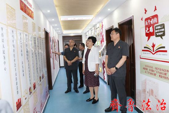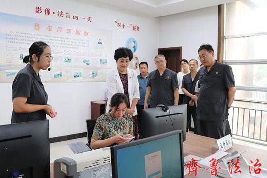 张明磊一行实地查看了陈庄法庭人民调解室、党性教育中心、法院诉讼服务中心、第一审判庭等场所,听取了孙学军院长关于开展“为群众办实事示范法院”创建活动情况的汇报,查阅了相关资料,并就“为群众办实事示范法院”创建活动中期测评与班子成员、专委、各业务庭室负责人座谈交流。