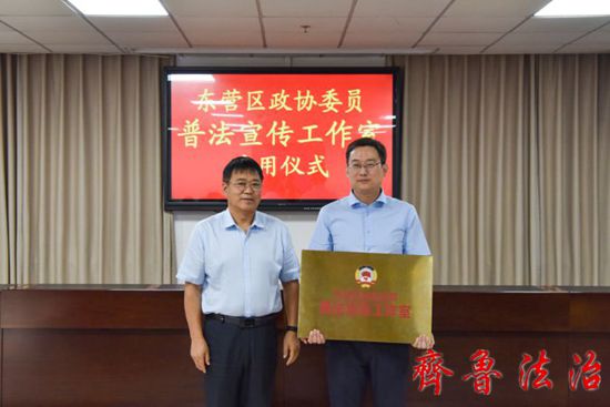 齐鲁法治(东营讯)燕翠莲 7月8日上午,东营市东营区政协委员普法宣传室揭牌仪式在东营区法院举行。区政协党组书记、主席杜书亮出席仪式并讲话,区法院党组书记、院长丁文强出席仪式并致辞。区政协、区法院的部分领导及部分政协委员参加仪式。