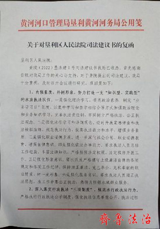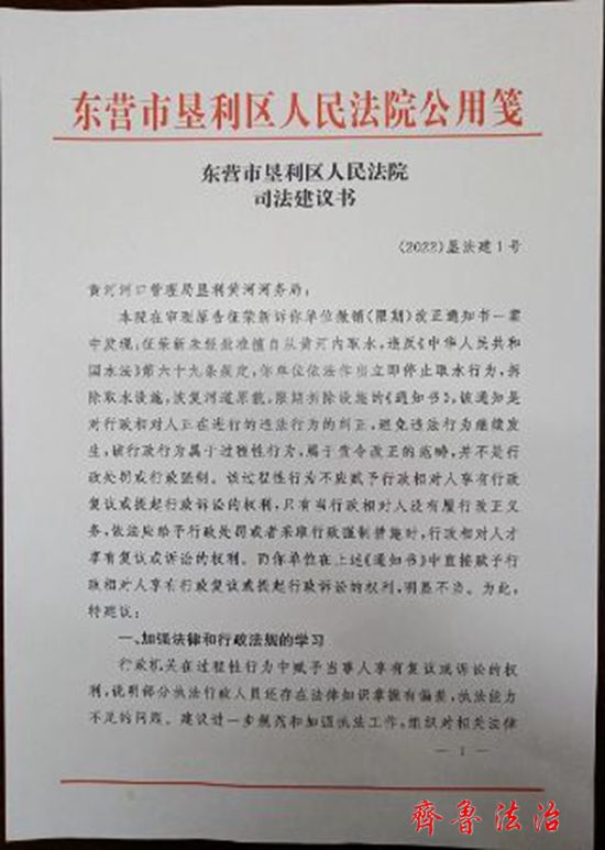 齐鲁法治(东营讯)李春军 为促进行政机关依法行政,加强黄河流域依法治理,近日,东营垦利区法院向黄河河口管理局垦利黄河河务局发出司法建议书。