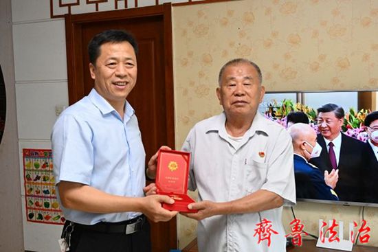 齐鲁法治(东营讯)李春军 历史映照初心,荣誉砥砺前行。7月1日上午,东营垦利区法院党组书记、张志刚前往党龄超过50年的退休老党员李月臣家中颁发纪念章并看望慰问,向老党员转达了党组织的关怀和祝福。