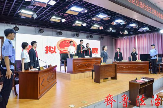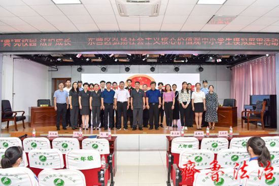 齐鲁法治(东营讯)李春军 为深入贯彻宣传民法典,弘扬社会主义核心价值观,增强中小学生的法治意识,东营市东营区法院第二场“典”亮校园•法护成长——弘扬社会主义核心价值观中小学生模拟庭审活动于2022年7月2日上午在东营区第三中学成功举办。东营区妇联、教育局、关工委等部门的有关领导及东营市文苑学校的百余名师生代表进行了现场观摩。