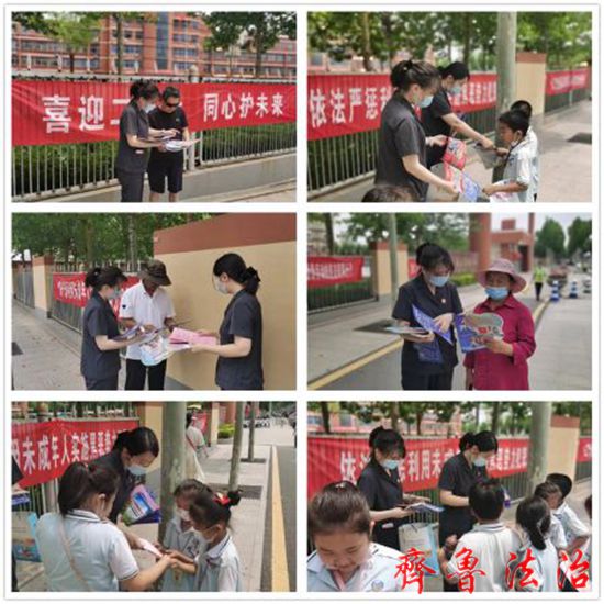 6月29日上午放学时间,东营利津县第二实验小学门前,东营利津法院刑庭干警正在对放学的孩子、老师及家长进行禁毒、打击黑恶势力及预防养老诈骗宣传。