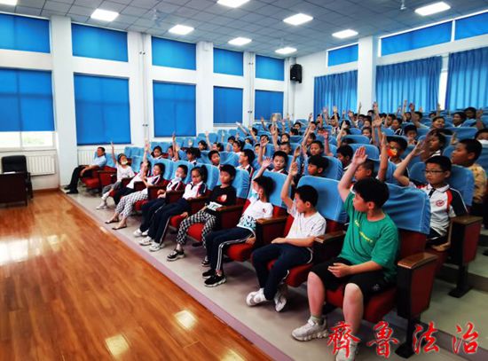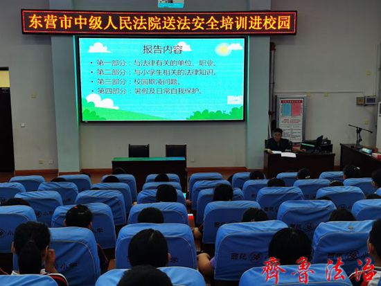 齐鲁法治(东营讯)李春军 6月28日,东营中院选派的“省加强农村基层党组织建设工作队”队员、民事审判第四庭干警袁永林走进帮扶村西范小学为150余名师生作法治辅导报告。