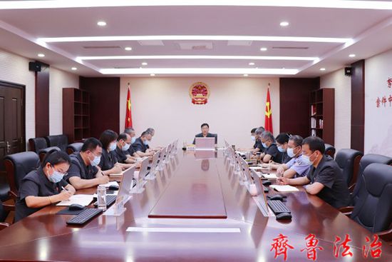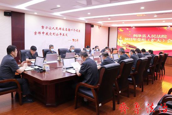 齐鲁法治(东营讯)王振营 5月24日上午,东营利津法院召开党组扩大会议,传达学习习近平总书记在庆祝中国共产主义青年团成立100周年大会上的重要讲话精神,听取审管办关于全院4月份全流程网上办案系统应用情况汇报,并就近期重点工作进行安排部署。党组书记、院长孙学军出席会议并讲话,党组副书记、副院长盖盛永主持会议,班子成员、审委会专职委员、庭室负责人参加会议。