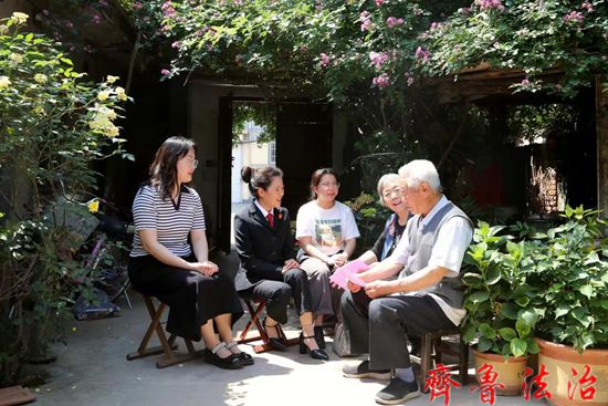 图为,5月17日,该院审判管理办办公室法官葛倩团队为一起养老诈骗案件,到郯城街道城里一社区81岁的退休教师李长修老人家中调查取证,并向老人讲解相关法律知识。