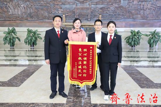 齐鲁法治(东营讯)王振营 5月9日下午,某保险公司工作人员来到东营中院将一面写有“倾心调解化纠纷、秉公执法暖民心”的锦旗送到环资庭法官的手里,表达对东营中院在一起人身保险合同纠纷案件中公正司法、悉心为民的感激之情。