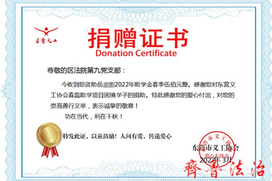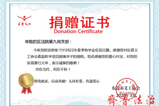 齐鲁法治(东营讯)王振营 近日,东营市义工协会为东营市东营区法院第九党支部送来了捐赠证书,感谢第九党支部全体党员对东营市义工协会春蕊助学项目困境学子的捐助。
