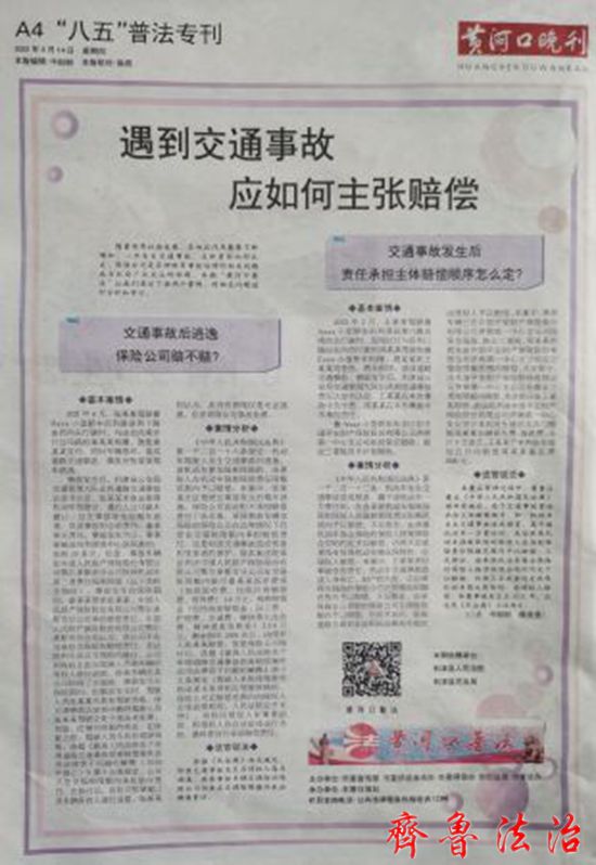 齐鲁法治(东营讯)李顺花 近日,东营利津法院陈庄法庭在《黄河口晚刊》发表了“遇到交通事故 应如何主张赔偿”的普法专刊,通过典型案例介绍和法官释法,对群众关注的机动车交通事故责任纠纷相关法律知识进行专项普法宣传。