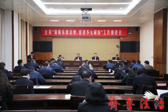 齐鲁法治(东营讯)李顺花 4月19日上午,东营广饶法院在乐安大厦会议中心组织召开全县“加强诉源治理、促进多元解纷”工作推进会。县法院党组书记、院长陈立田主持会议,县委常委、政法委书记刘乃斌,县司法局党组书记、局长宋安刚出席会议,县委政法委、县工商联、县域治理管理运行中心、县司法局、县住建局、县人社局、县农业农村局、县地方金融监督管理局、县人民银行分管领导,各镇街政法委员及矛调中心主任,各镇街法官工作站站长、民事审判团队团队长、速裁团队负责人、诉讼服务中心主任、立案庭庭长等40余人参加会议。