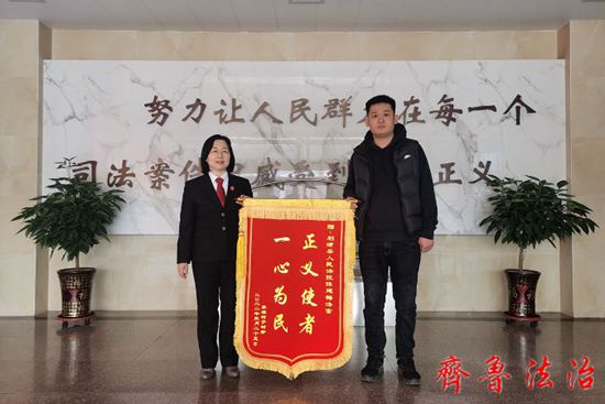 齐鲁法治(东营讯)李春军 3月29日,当事人于某的儿子小于将一面书有“一心为民 正义使者”的锦旗送到东营利津法院行政综合庭陈建梅法官手中,连连表示感谢:“谢谢陈法官,让您受累了,赔偿款已经收到,解决了我们全家的后顾之忧,真诚地感谢您!”