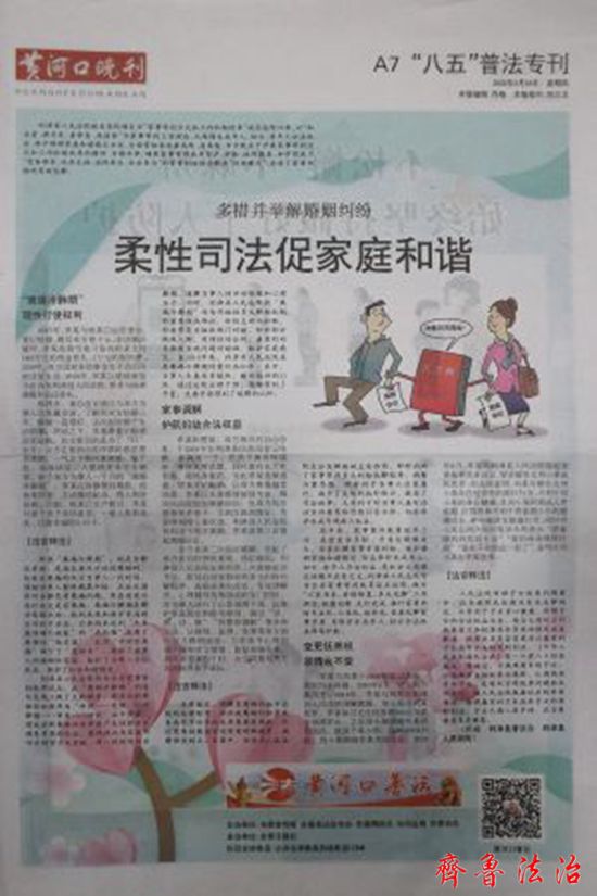 齐鲁法治(东营讯)李春军 近日,东营利津法院在《黄河口晚刊》发表了“多措并举解婚姻纠纷,柔性司法促家庭和睦”的普法专刊,通过典型案例介绍和法官释法,对群众关注的离婚纠纷相关法律知识进行专项普法宣传。